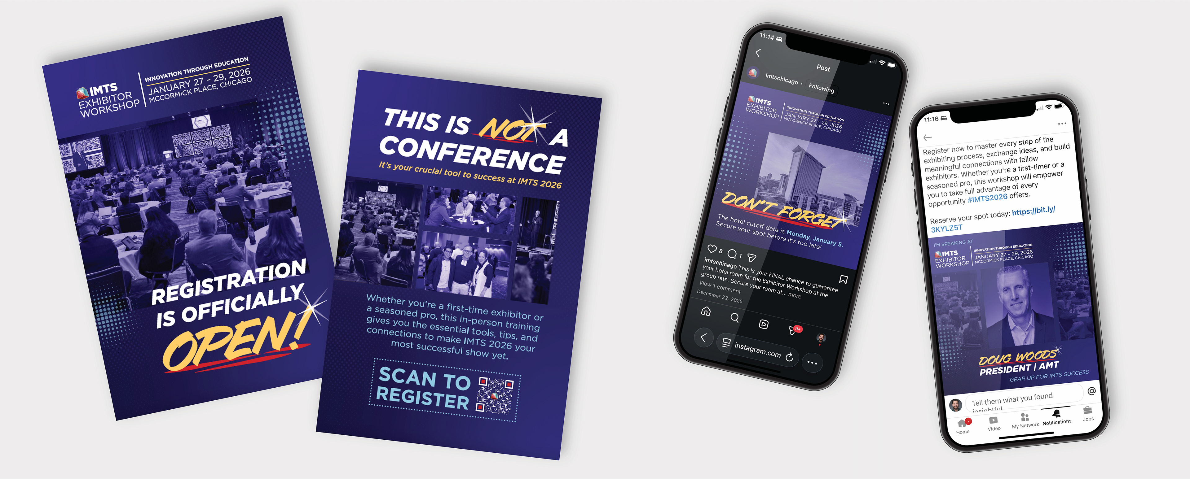 I led the art direction and design for the IMTS Exhibitor Workshop campaign, a pre-event conference designed to prepare exhibitors for IMTS. The challenge was to create a campaign that felt clearly connected to the IMTS 2026 show brand while still standing apart as its own initiative. To solve this, I concepted an anti-ad approach built around the headline “THIS IS NOT A CONFERENCE.” Placed against familiar conference imagery, the contradiction was intentionally jarring. This concept was designed to stop the viewer and spark curiosity to drive deeper audience engagement.