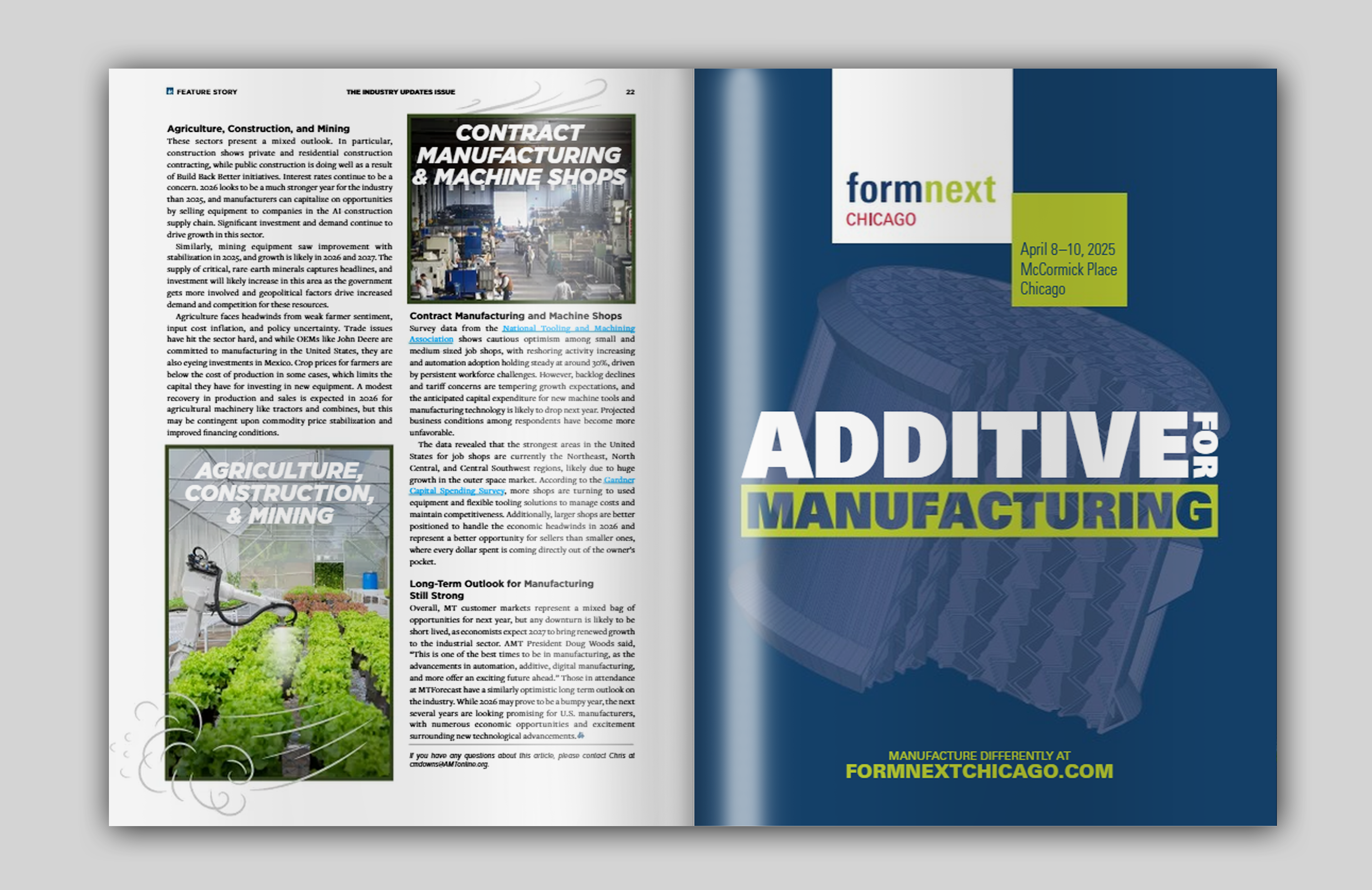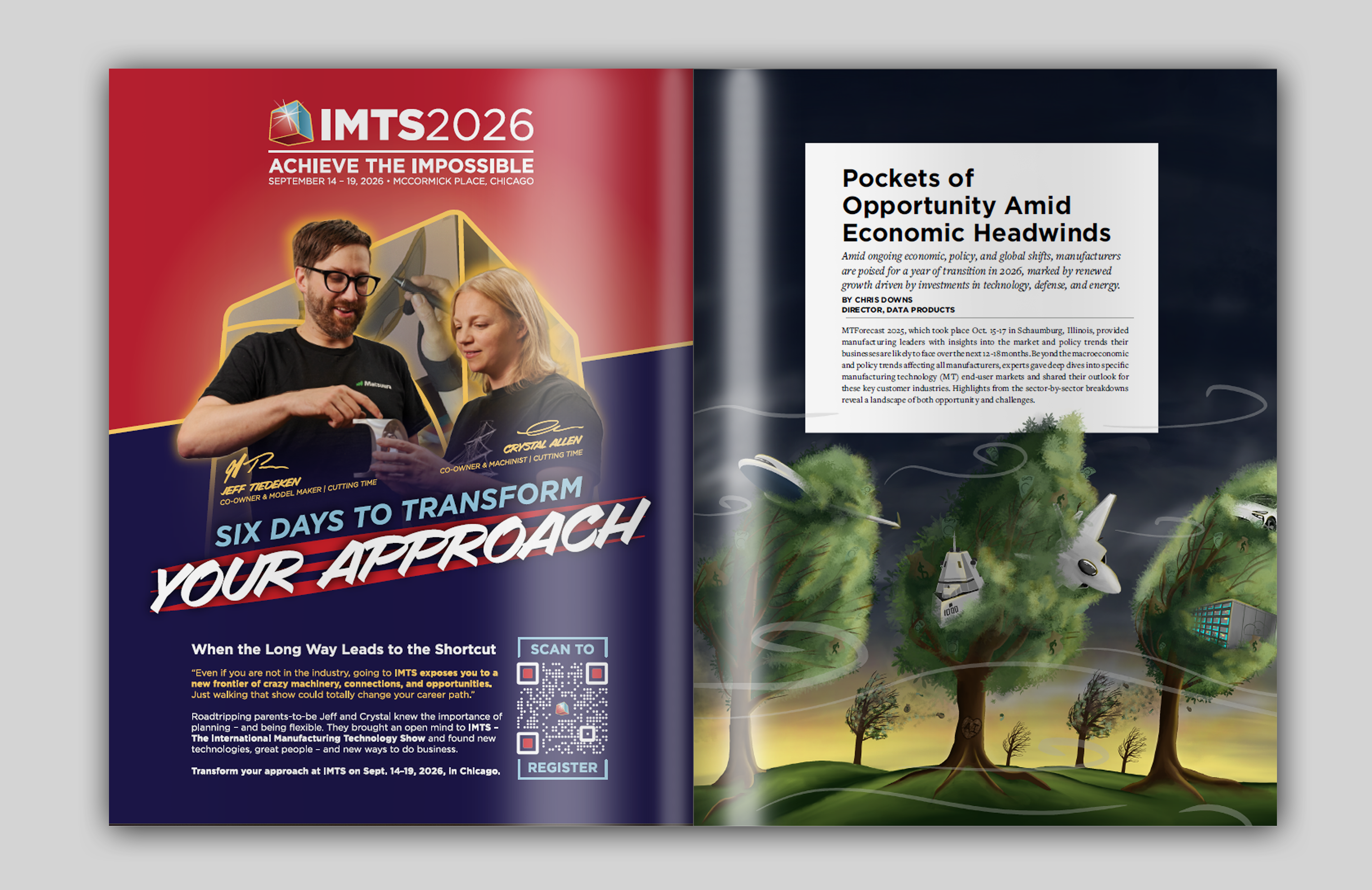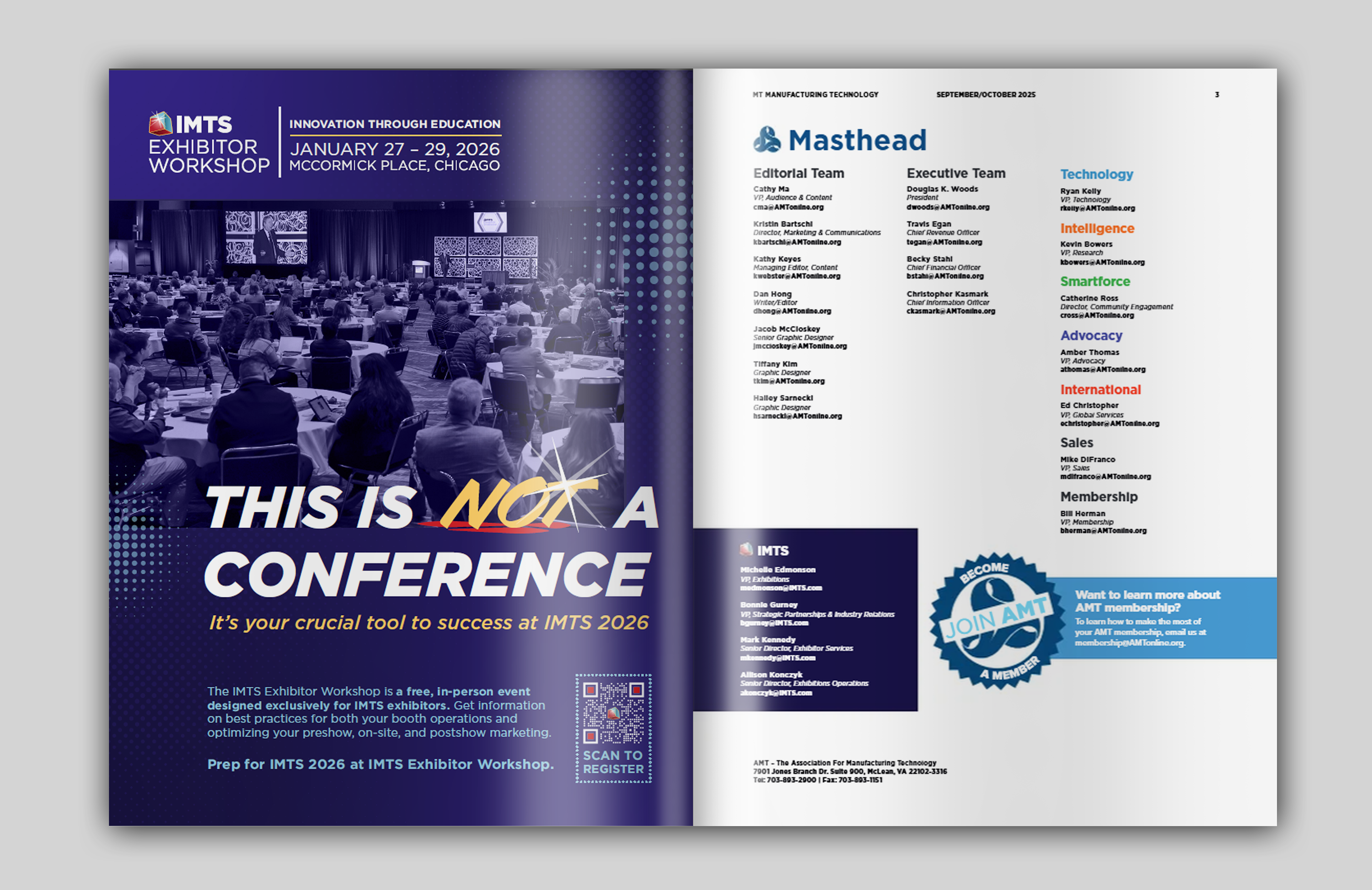 At AMT – Association for Manufacturing Technology, I played a key role in transforming our association newsletter from a traditional newspaper into a modern, bi-monthly magazine publication. I created layouts, infographics, comic strips, illustrations, and more to produce a comprehensive and visually appealing source of information for the manufacturing industry. All advertisements in these spreads were also designed by me.